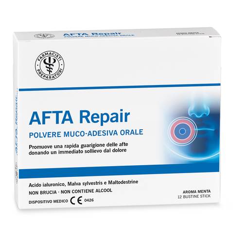 Dispositivo medico. Prodotto in polvere muco-adesiva a base di acido ialuronico, malva sylvestris e maltodestrine da mais con azione filmogena e protettiva per il trattamento di afte (locali o diffuse) e microlesioni della bocca. Promuove una rapida guarigione dalle afte donando un immediato sollievo dal dolore. Favorisce la guarigione di afte e microlesioni della bocca. Forma sulle microlesioni un film protettivo che riduce dolore e rossore.