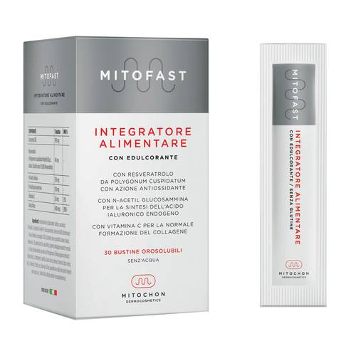 Integratore alimentare in bustine orosolubili a base di coenzima Q10, resveratrolo, vitamina C, N-acetil cisteina, N- acetil glucosammina e acido folico.